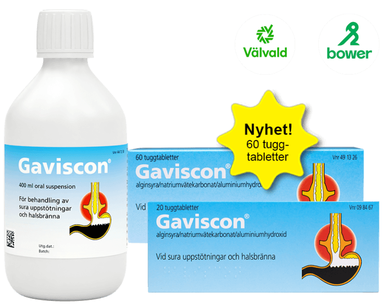 Gaviscon® tuggtabletter och oral suspension innehåller aluminiumhydroxid, natriumvätekarbonat, alginsyra (tuggtabl.), natriumalginat (oral susp.), kalciumkarbonat (oral susp.). Receptfritt läkemedel. Ej förmån. Används vid sura uppstötningar och halsbränna, samt efter läkarordination vid inflammation i matstrupen och bråck i mellangärdet. Tala med läkare eller apotekspersonal innan du använder Gaviscon om du har kraftigt nedsatt njurfunktion. Innehåller hög halt natrium (oral suspension). Om du inte mår bättre eller om du mår sämre inom en vecka måste du tala med din läkare. Läs bipacksedeln noggrant före användning. Nordic Drugs, www.nordicdrugs.se.